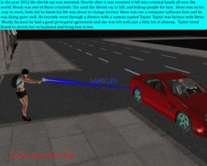 This story takes place in the future. A woman named Taylor hires a woman to shrink her ex husband. Brook shrinks Steve and delivers him to Taylor. Taylor has her way with Steve. There is some oral and vaginal insertion in this story. It ends badly for Steve as he is accidentally crushed (barefoot) by Taylor. Brook also shrinks two other men and makes them be her foot slaves. There is also some scenes of brook picking up Steve inside his car.