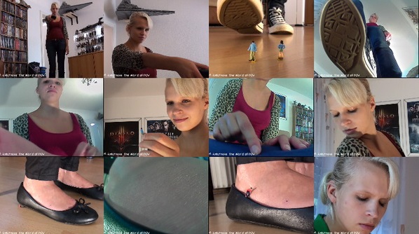 Two great new movies with Liongirl and some shrunken people. First she shrinks her ex boyfriend and his new girl to have some revenge. Then a little man tries to climb up on her shoe - but he gets caught and soon he finds himself inside the shoe. Many great close-ups, crush, butt-crush, out-of-shoe pov and a tall girl - Enjoy!